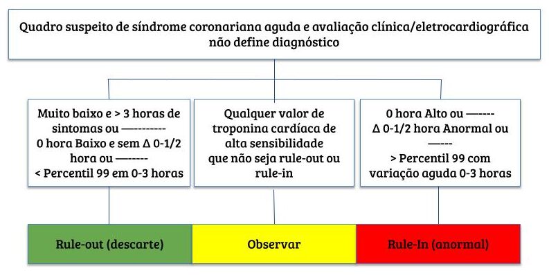 Há variação de acordo com o kit de troponina – por isso, sempre cheque qual os valores do kit do seu serviço. Nos casos de troponina de alta sensibilidade, em um paciente com início dos sintomas há mais de 3 horas (e sem recorrência), um nível abaixo dos valores classificados como muito baixos seria suficiente para descartar IAM (embora não descarte outros diagnósticos, como angina instável). Nas demais situações, há necessidade de mais de uma dosagem de troponina (em 1 ou 2 horas), embora valores muito elevados (por exemplo, acima de 5x o limite da normalidade) indiquem alta probabilidade de IAM mesmo em uma dosagem isolada.