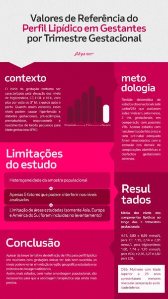 Os níveis maternos de componentes lipídicos são essenciais para a saúde materna e para o desenvolvimento fetal. No entanto, valores de referência da população geral podem ser inadequados para o diagnóstico de dislipidemia e avaliação dos riscos associados nas gestantes.