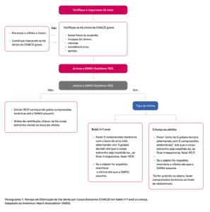 Fluxograma 1 . Manejo de Obstrução de Via Aérea por Corpo Estranho (OVACE) em bebê (<1 ano) e criança. Adaptado da American Heart Association (2025)
